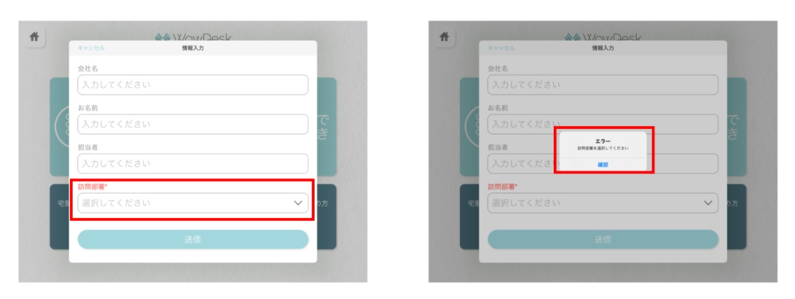 ※WowDeskアプリで番号なし受付を選択した画面で、訪問部署の選択が必須項目に変更。